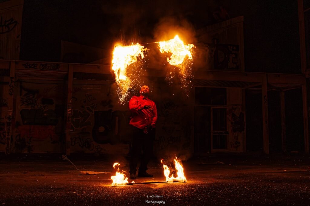 Chaque spectacle de feu est conçu comme une création artistique sur mesure, mêlant jonglerie de feu, mouvements chorégraphiés et tableaux visuels marquants. Les performances sont adaptées aux contraintes des lieux franciliens et préparées dans le respect strict des règles de sécurité, pour une expérience spectaculaire et maîtrisée.